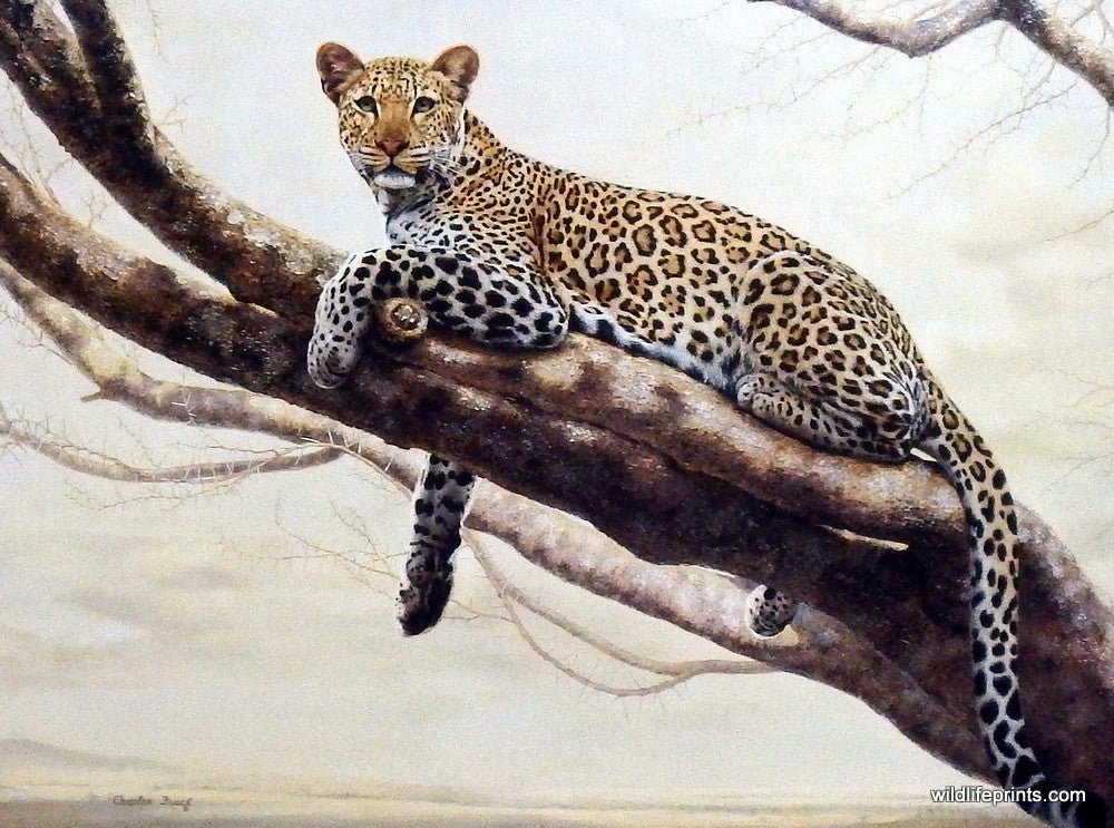 Wildlife artist Charles Frace has captured the majesty of the AFRICAN LEOPARD in this painting. Leopards are primarily nocturnal, resting in trees during the day. In fact, leopards are so comfortable in trees that they can hunt from tree branches, and they have been known to move their kill into trees to protect from other predators.