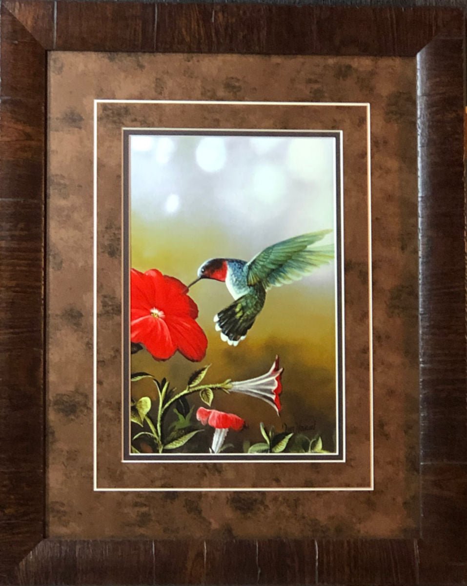 A ruby-throated hummingbird takes nectar from a beautiful red flower.