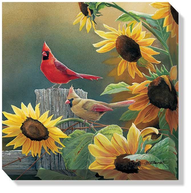 A pair of cardinals perch on a wooden fence right next to a bunch of sunflowers in Susan Bourdet's wrapped canvas Sunny Side Up Cardinal.