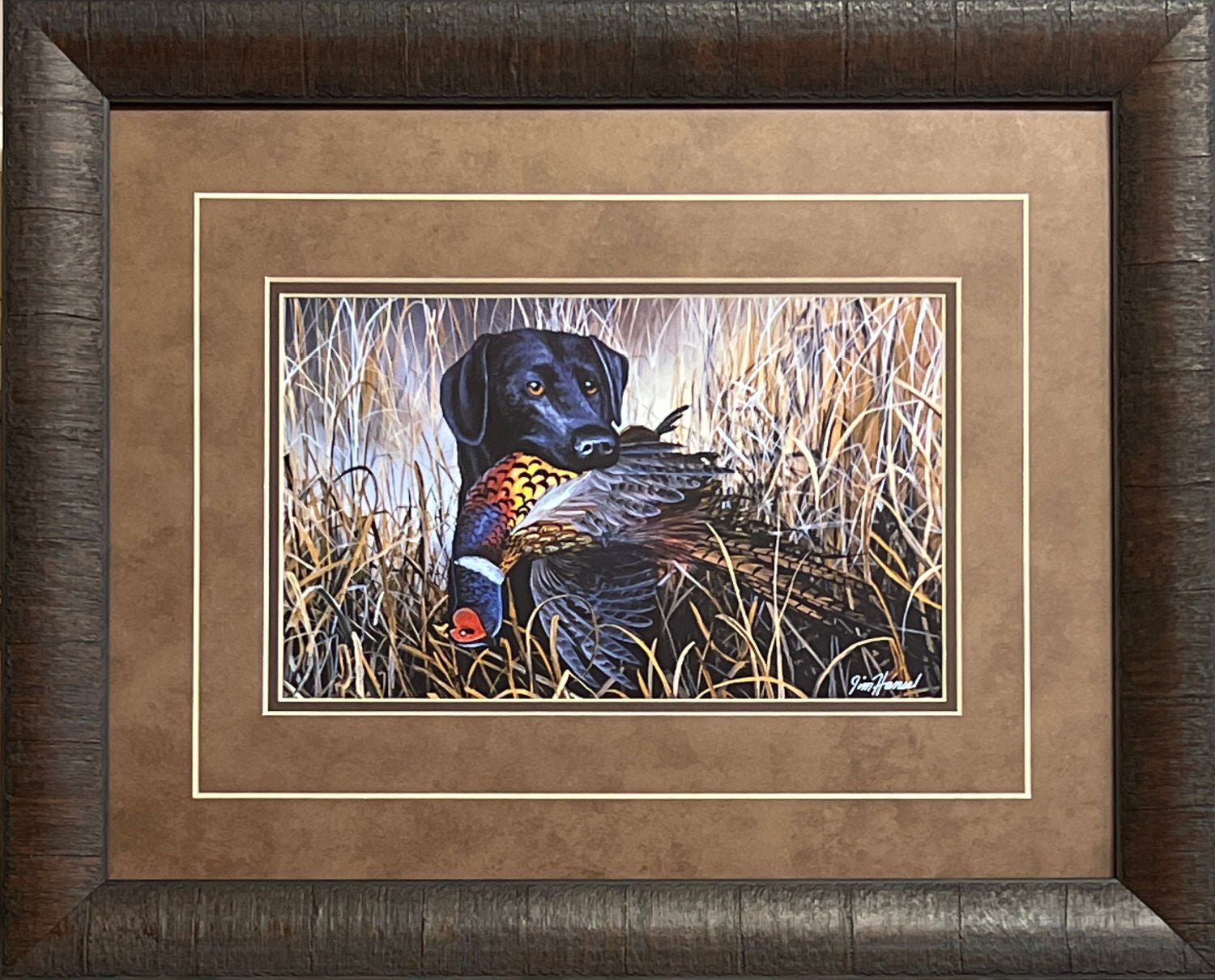 A black lab has retrieved the hunter's pheasant trophy in Jim Hansel's Bird Season. What a proud master he must be.