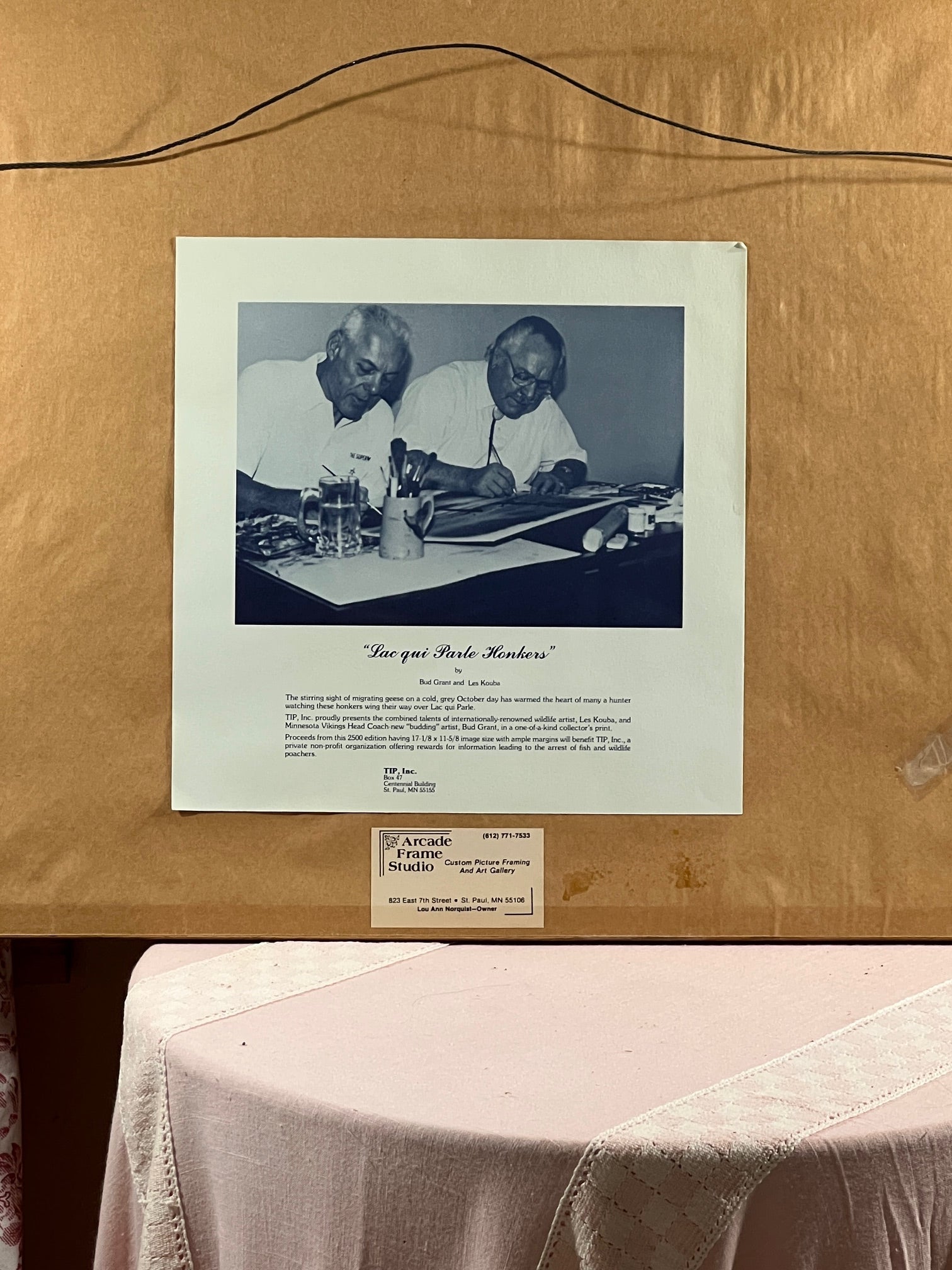 “Lac Qui Parle Honkers” is a collectible 1990s-era lithograph showing geese in flight over Minnesota, signed by both wildlife artist Les Kouba and coach-artist Bud Grant. Produced to support conservation efforts, it's a limited-edition piece