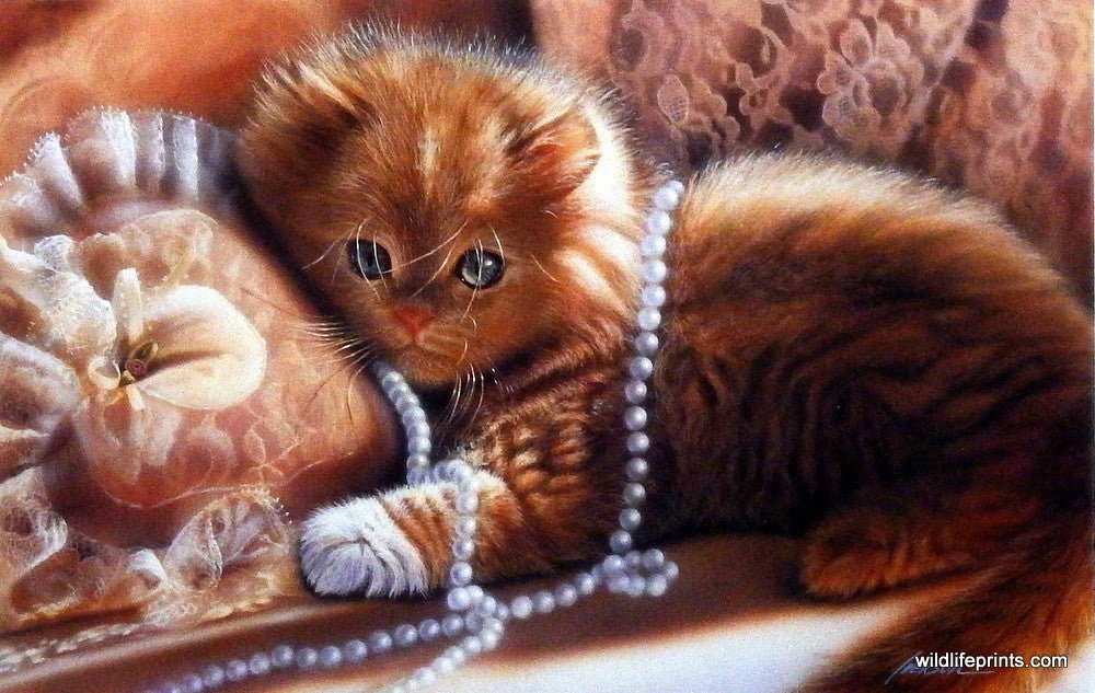 Ron Iverson has done an adorable image of a little orange kitten wearing a set of pearls as though they belong to her.