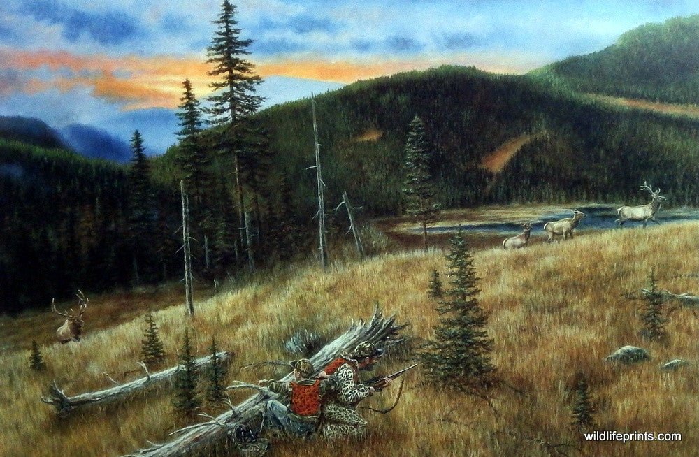 Father and son each have a male elk in their sights. IT'S A BULL...I KNOW is a great hunting print by talented wildlife artist Brian Kuether. Those magnificent antlers on a mature bull elk can weight up to 40 pounds. The elk antlers fall off in March, start growing back in May, and are full bone by September in time for the fall rut.