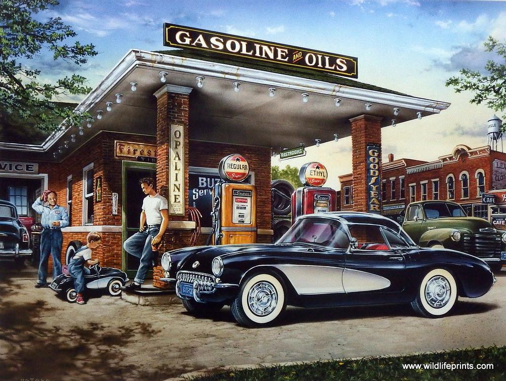 Dan Hatala's print is a nostalgic scene from the days of full service gas stations. The two guys are admiring each other's Corvettes, although one is just a pedal car.