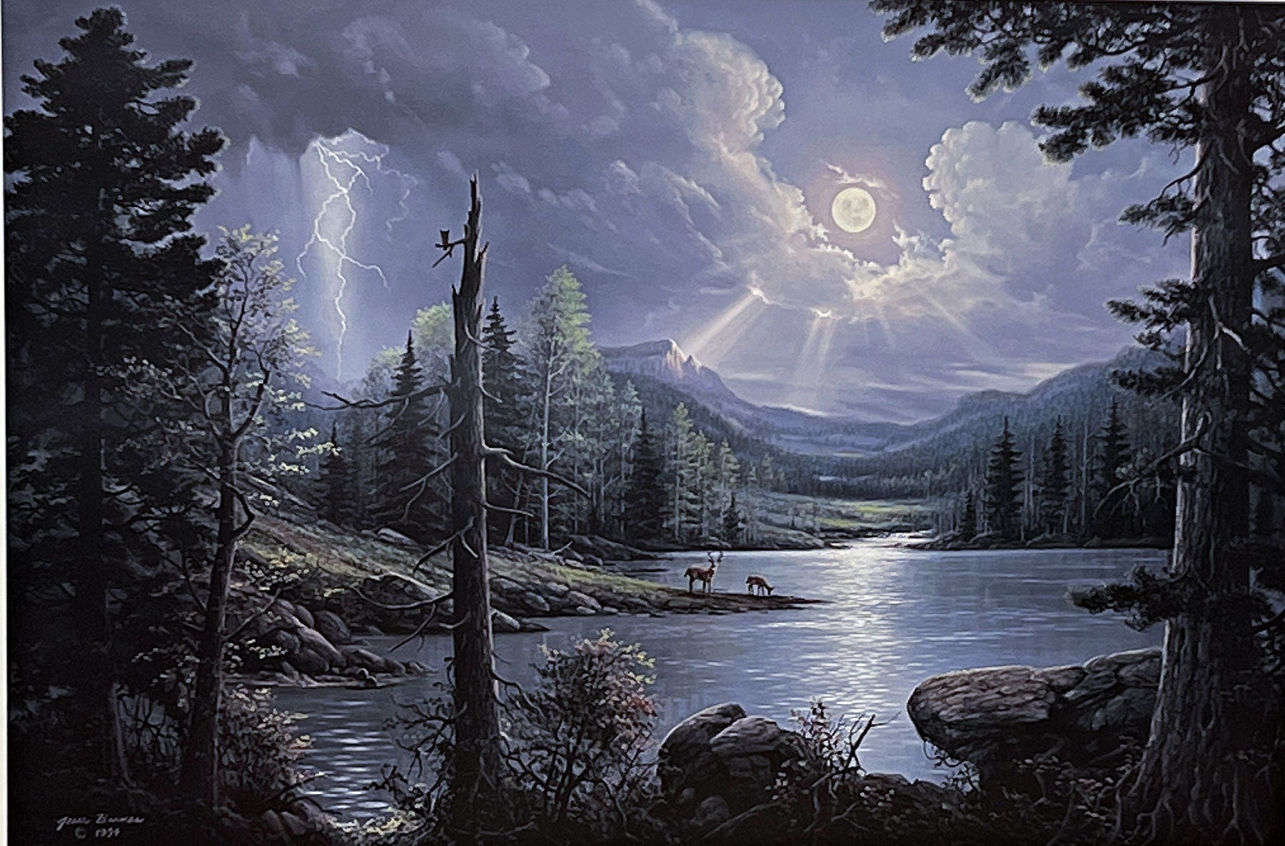 Bring the serene beauty of the wilderness into your home with Moonlight Reflections by Jessie Barnes. This stunning 1994 limited edition print (#2015 of 2800) captures a dramatic moment in nature—lightning flashing in the distance, moonbeams breaking through clouds, and deer peacefully drinking from a reflective mountain lake. A striking and peaceful composition filled with rich detail and emotion.