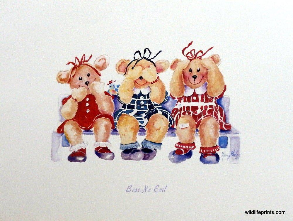 This adorable print by Nancy Phelps showcases the "see no evil, hear no evil and speak no evil" by a cute little bear dressed in a little girl's outfit.