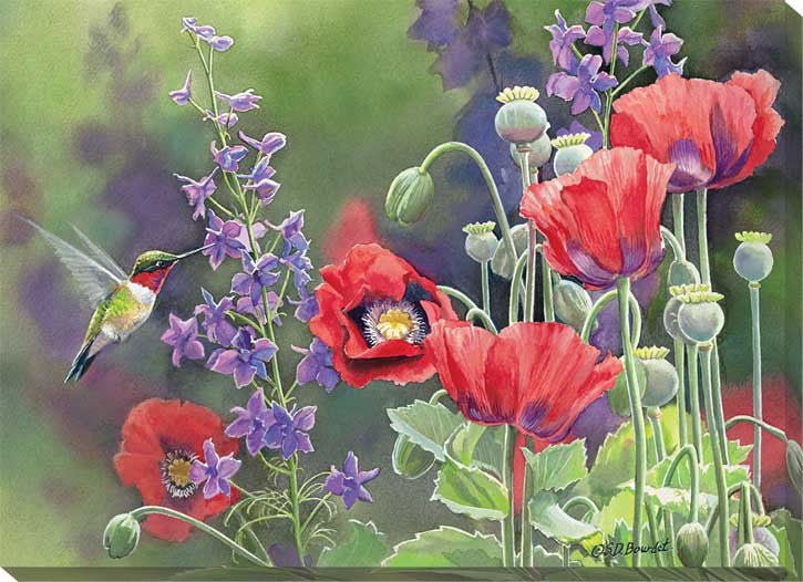 A hummingbird is seeking some sweet treats from the poppy plants in this Susan Bourdet wrapped canvas.